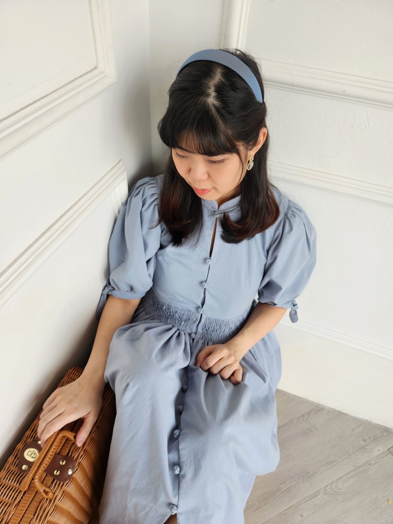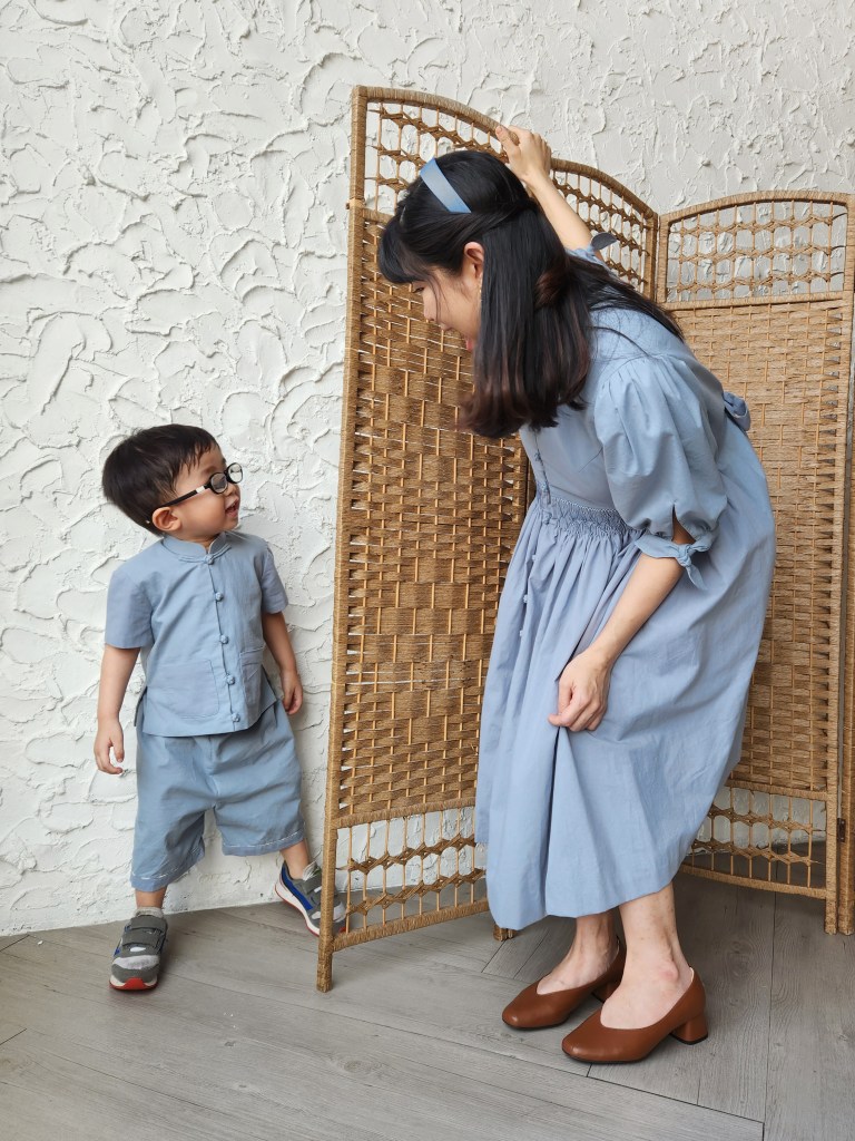 For mom, we create billowy sleeves and an airy A-line skirt, a perfect silhouette for the hottest summer days. The happiest thing about this dress is we design an invisible side pocket for women who tend to love it when they find something with dress pockets. We chose to show in a light blue cotton linen dress with waved mandarin collar and hand-smocked detail at the empire waist, which took a slightly minimalist and short of a romantic feel.