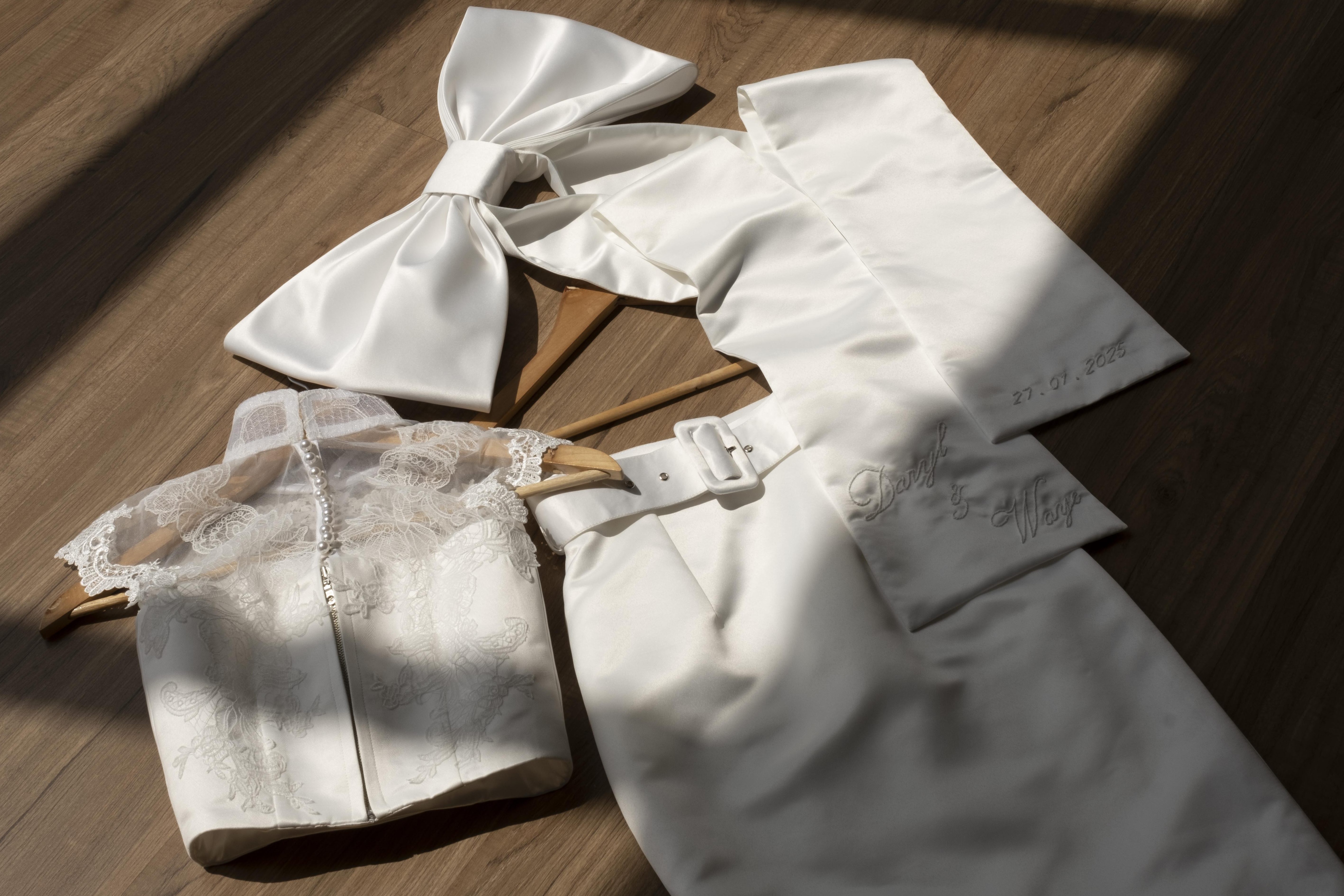 Statement Bow with Hand Embroidery: The pièce de résistance is a large, dramatic bow adorned with hand-embroidered details—the couple’s names and their special date. This thoughtful touch transforms the bow into a keepsake, capturing the essence of the day in the most stylish way.