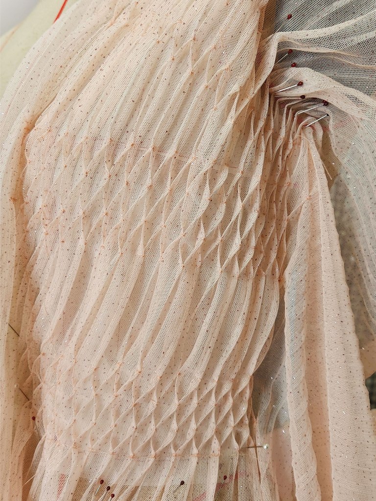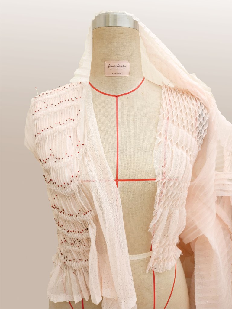 In this sewing project, I tried honeycomb smocking on pleats fabric. At first, I thought it would be easier to do smocking. Then I found it harder which is out my expectation. It needs to pin every pleat to get the proper measurement of the outcome. It was a labor-intensive yet rewarding process to create an aesthetically pleasing piece of clothing.
